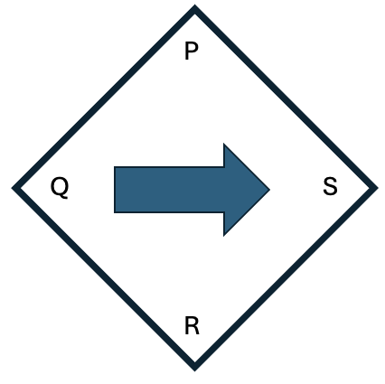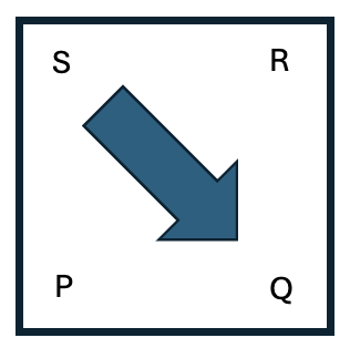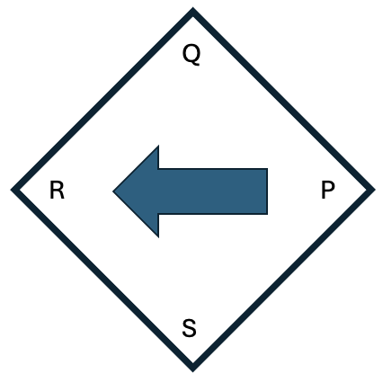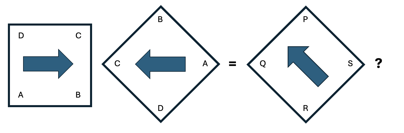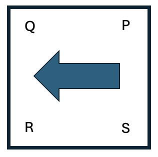 Kotak kiri rotasi 135 derajat berlawanan jarum jam, maka kotak kanan menjadi S di kiri atas, R di kanan atas, P di kiri bawah, Q di kanan bawah